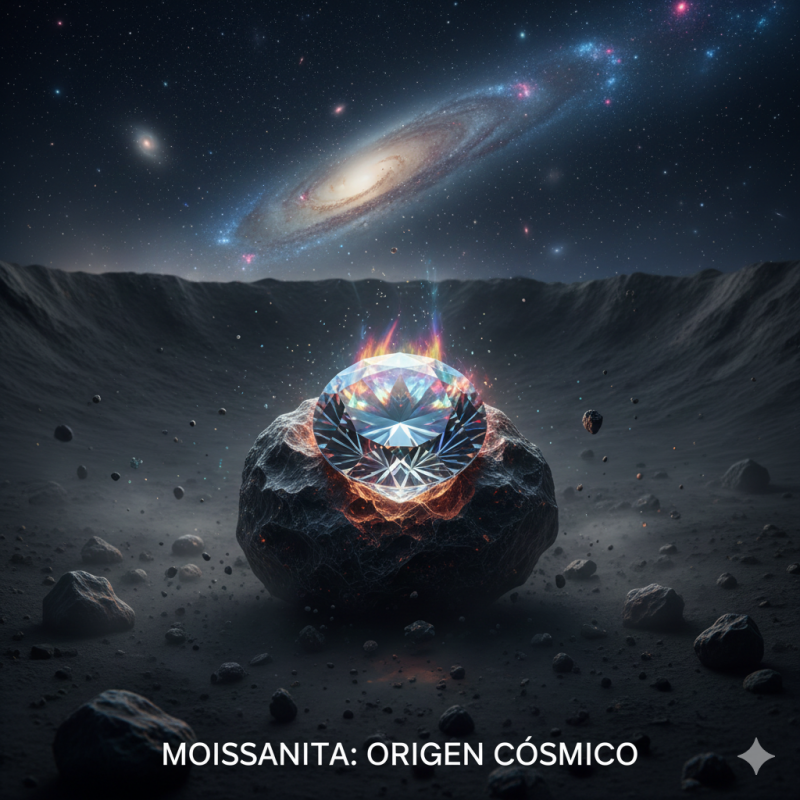 A diferencia de los diamantes que se forman en las profundidades de la Tierra, la moissanita natural fue descubierta por primera vez en 1893 dentro de un cráter dejado por un meteorito en Arizona. El Dr. Henri Moissan (quien ganó el Premio Nobel) encontró partículas de este mineral y, por un tiempo, ¡creyó que eran diamantes del espacio! Por eso se le conoce como la "gema nacida de las estrellas".