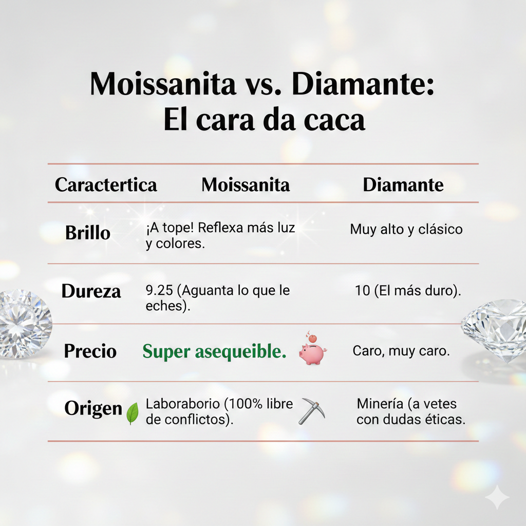 Muchos usuarios buscan: “¿Cómo saber si es moissanita o diamante?”. Aquí te dejamos la comparativa técnica: